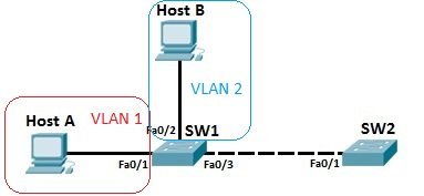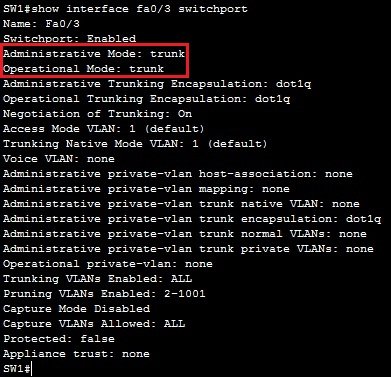 Now the link between SW1 and SW2 can carry traffic from both the VLAN1 and VLAN2. You can verify that an interface is indeed a trunk interface by using the show interface Fa0/3 switchport command on SW1: