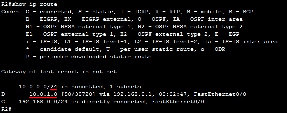 Now, R1 is sending only one route to reach both subnets to R2. We can verify that by using the show ip route command on R2: