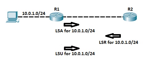 After configuring OSPF on both routers, routers exchange LSAs to describe their respective topology database. Router R1 sends an LSA header for its directly connected network 10.0.1.0/24. Router R2 check its topology database and determines that it doesn’t have information about that network. Router R2 then sends Link State Request message requesting further information about that network. Router R1 responds with Link State Update which contains information about subnet 10.0.1.0/24 (next hop address, cost…).