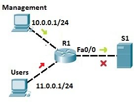 We want to allow traffic from the management LAN to the server S1. First, we need to write an ACL to permit traffic from LAN 10.0.0.0/24 to S1. We can use the following command on R1: