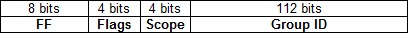 IPv6 multicast addresses start with FF00::/8. After the first 8 bits there are 4 bits which represent the flag fields that indicate the nature of specific multicast addresses. Next 4 bits indicate the scope of the IPv6 network for which the multicast traffic is intended. Routers use the scope field to determine whether multicast traffic can be forwarded. The remaining 112 bits of the address make up the multicast Group ID.
