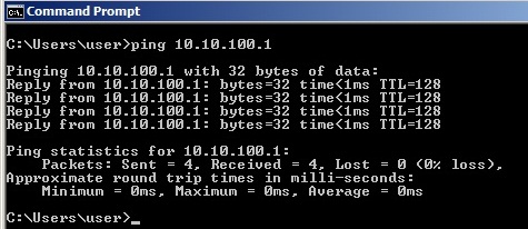 In the example above we have pinged the ip address 10.10.100.1. By default, ping on Windows sends four ICMP request packets. As you can see from the output above, the host with the IP address of 10.10.100.1 is reachable and has replied with four ICMP reply packets. You can also see that the remote host has replied within 1 ms (time<1ms), which indicates that the network is not congested.