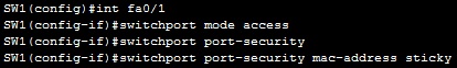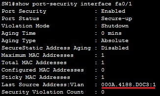 Next, by using the show port-security interface fa0/1 we can see that the switch has learned the MAC address of host A: