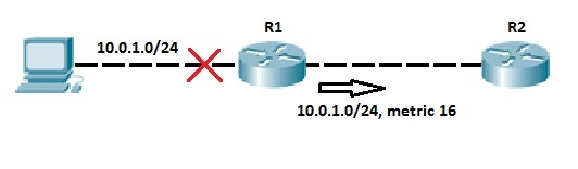 Router R1 is directly connected to the 10.0.1.0/24 subnet. Router R1 runs RIP and the subnet is advertised to R2. When the R1’s Fa0/1 interface fails, the route advertisement is sent by R1 to R2 indicating that the route has failed. The route has a metric of 16, which is more than the RIP’s maximum hop count of 15, so R1 considers the route to be unreachable.