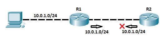 Router R1 has a route to the subnet 10.0.1.0/24 that is advertised to router R2 by using RIP. Router R2 receives the update and stores the route in its routing table. Router R2 knows that the routing update for that route has come from R1, so it won’t advertise the route back to router R1. Otherwise, if the network 10.0.1.0/24 goes down, router R1 could receive a route to the subnet 10.0.1.0/24 from R2. Router R1 would think that R2 has the route to reach the subnet, and would send packets destinated for the 10.0.1.0/24 to R2. R2 would receive the packets from R1 and sends them back to R1, because R2 thinks that R1 has a route to reach the subnet, thereby creating a routing loop.