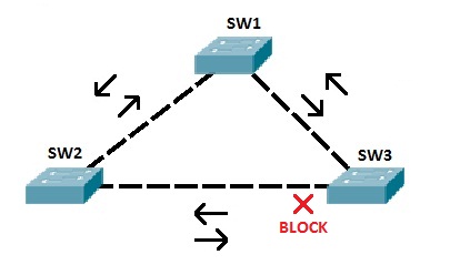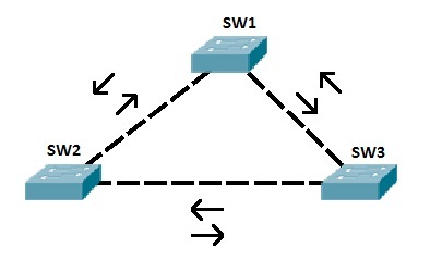 SW1 sends a broadcast frame to SW2 and SW3. Both switches receive the frame and forward the frame out every port, except the port the frame was received on. So SW2 forwards the frame to SW3. SW3 receives that frame, and forwards it to SW1. SW1 then again forwards the frame to SW2! The same thing also happens in the opposite direction. Without STP in place, these frames would loop forever. STP prevents loops by placing one of the switch ports in blocking state.