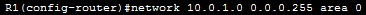 Router R1 has three networks directly connected. To include only the 10.0.1.0 subnet in the OSPF routing process, the following network command can be used:
